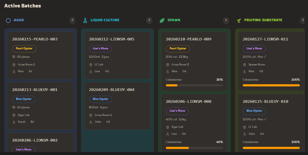 Manages every batch from inoculation through colonization, spawning, fruiting substrate, and harvest. Supports table, Kanban board, and calendar views. Tracks species, strains, growth medium, container types, stage duration, and propagation lineage. -