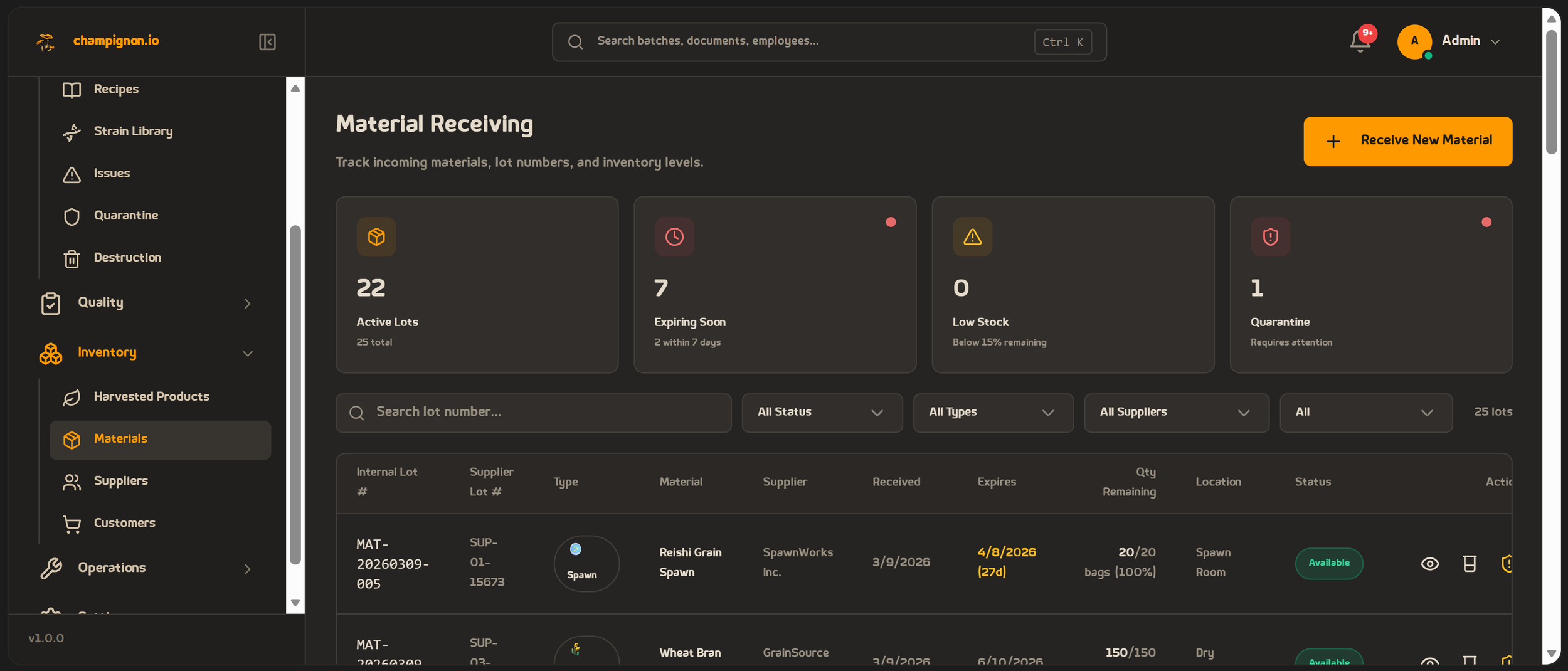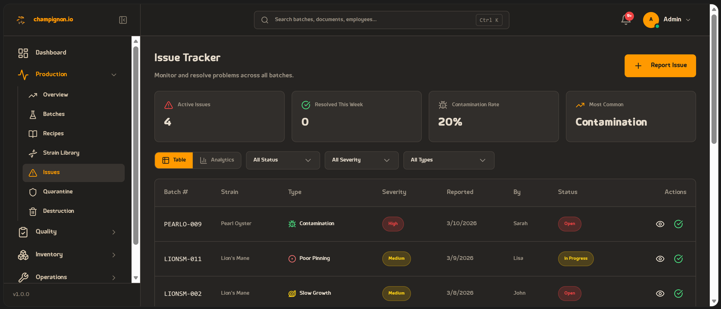 Manages every batch from inoculation through colonization, spawning, fruiting substrate, and harvest. Supports table, Kanban board, and calendar views. Tracks species, strains, growth medium, container types, stage duration, and propagation lineage. -