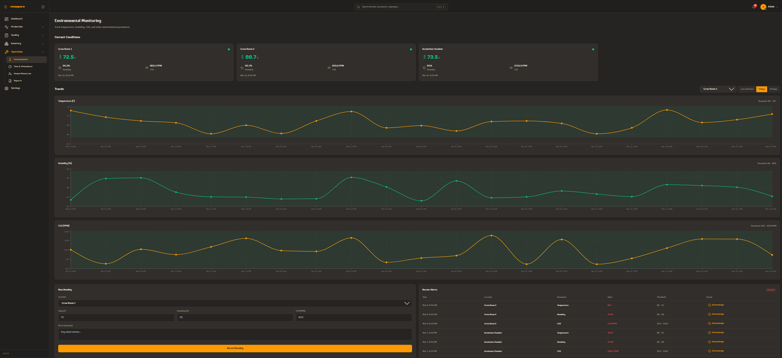 Tracks temperature, humidity, and CO2 across every grow room. Correlates readings with active batch locations. Alerts you instantly when conditions drift outside thresholds — before your crop is at risk. -